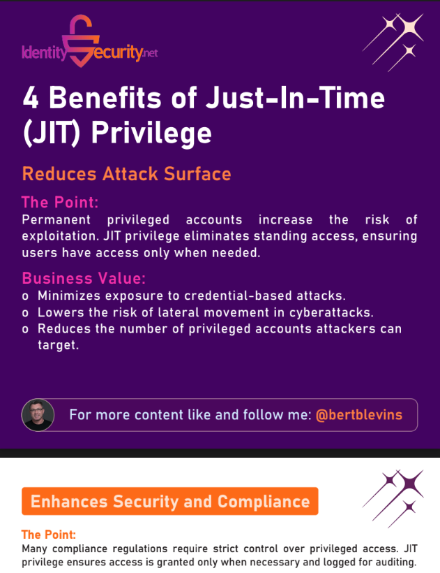JIT privilege eliminates persistent privileged credentials, reducing the likelihood of credential theft or misuse.